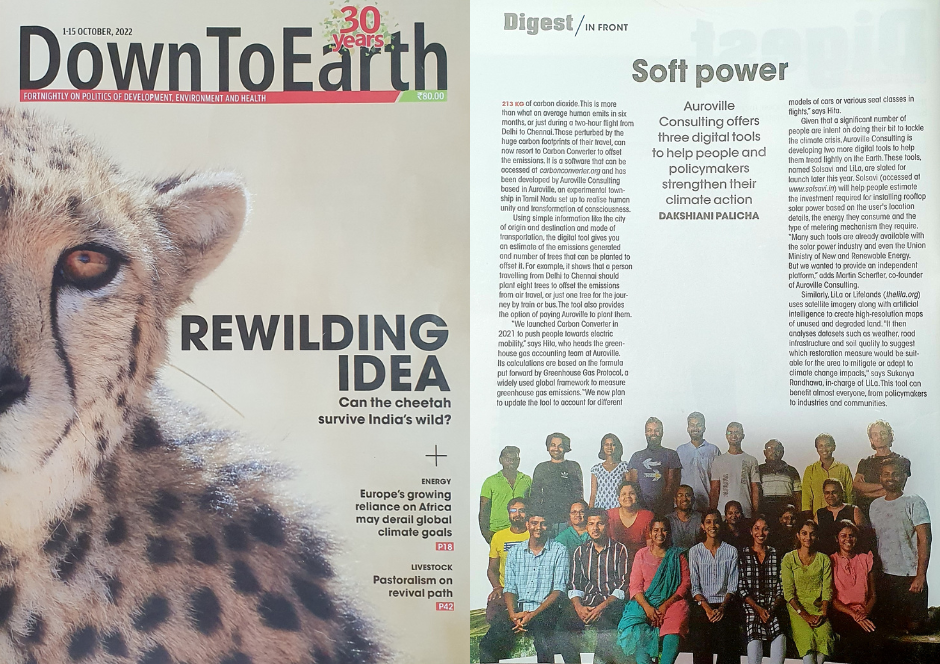 “213 KG of carbon dioxide. This is more than what an average human emits in six months, or just during a two-hour flight from Delhi to Chennai,” is the opening statement of the article by Dakshiani Palicha in Down to Earth’s 30th anniversary magazine released this month. She also states “Auroville Consulting offers three digital tools to help people and policymakers strengthen their climate action.”