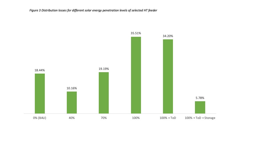 Solar energy penetration levels of 40% and 70% shows improvements in distribution losses over business as usual. While the distribution losses increase with 100% solar energy, as net energy flow increases, the addition of ToD tariffs and energy storage is able to reduce distribution losses from a 18.44% to a 5.78% (refer to Figure 3).