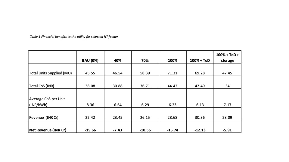 For the selected feeder the utility is current making an annual loss of INR 15.66 Crore on the supply of electricity to its consumers, as its cost of supply is higher than the revenue collected through electricity billing. The introduction of distributed solar energy, ToD tariffs and energy storage is able to reduce this revenue gap by INR 9.75 Crores from a 15.66 Crore in BAU to INR 5.91 Crore for 100% solar, ToD tariffs and energy storage (refer to Table 1). These financial benefits are expected to increase over time, as the levelized cost of solar and energy storage is assumed to be fixed over the contract period, whereas both cost of grid supply and consumer tariffs are expected to by at least the average inflation rate.